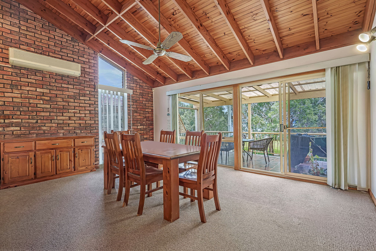 Upstairs, you'll find three spacious bedrooms with built-in wardrobes, a huge main bedroom with a retreat, an ensuite, a walk-in robe, and a private deck. The expansive open-plan lounge, dining area with adorned cathedral ceilings and exposed Oregon timber frame create an ambience of grandeur and sophistication, and a separate modern kitchen with a timber ceiling creates a welcoming and functional living space. The three-way modern bathroom adds a touch of luxury. Step outside onto the full-length front deck, an idyllic setting for family gatherings that offers panoramic views of the magnificent water scenery.