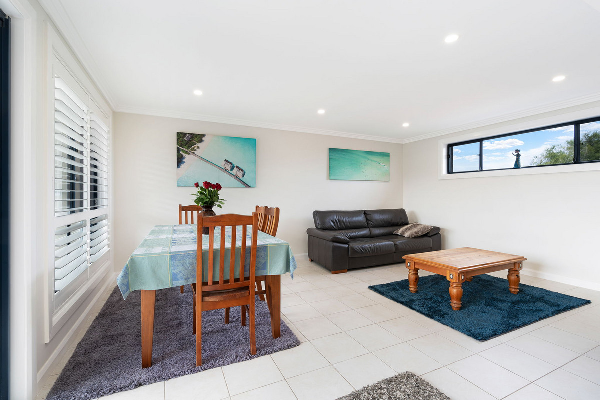 -Open plan lounge and dining room leading out to a spacious balcony with beautiful ocean views - Plantation shutters in living areas