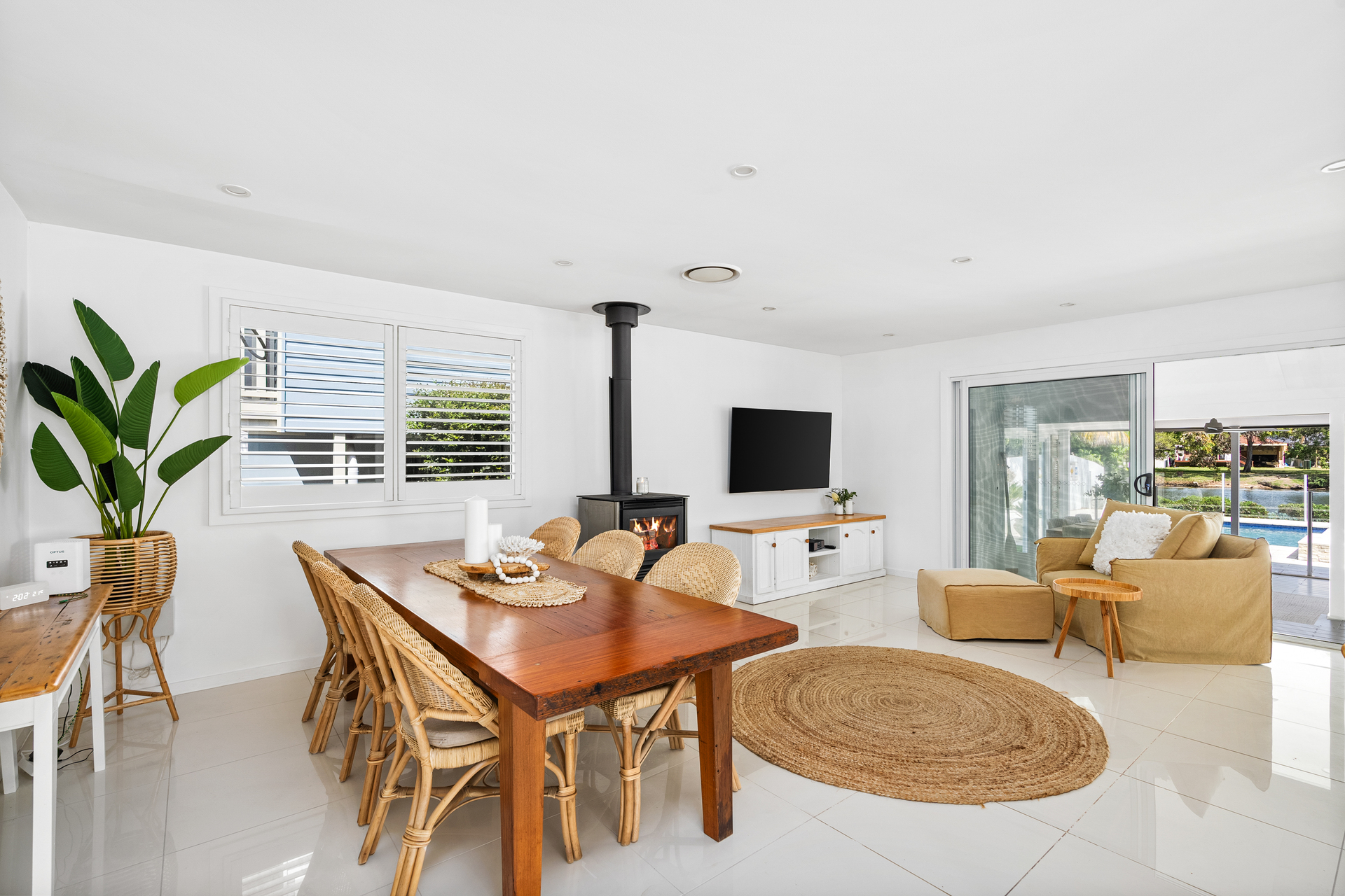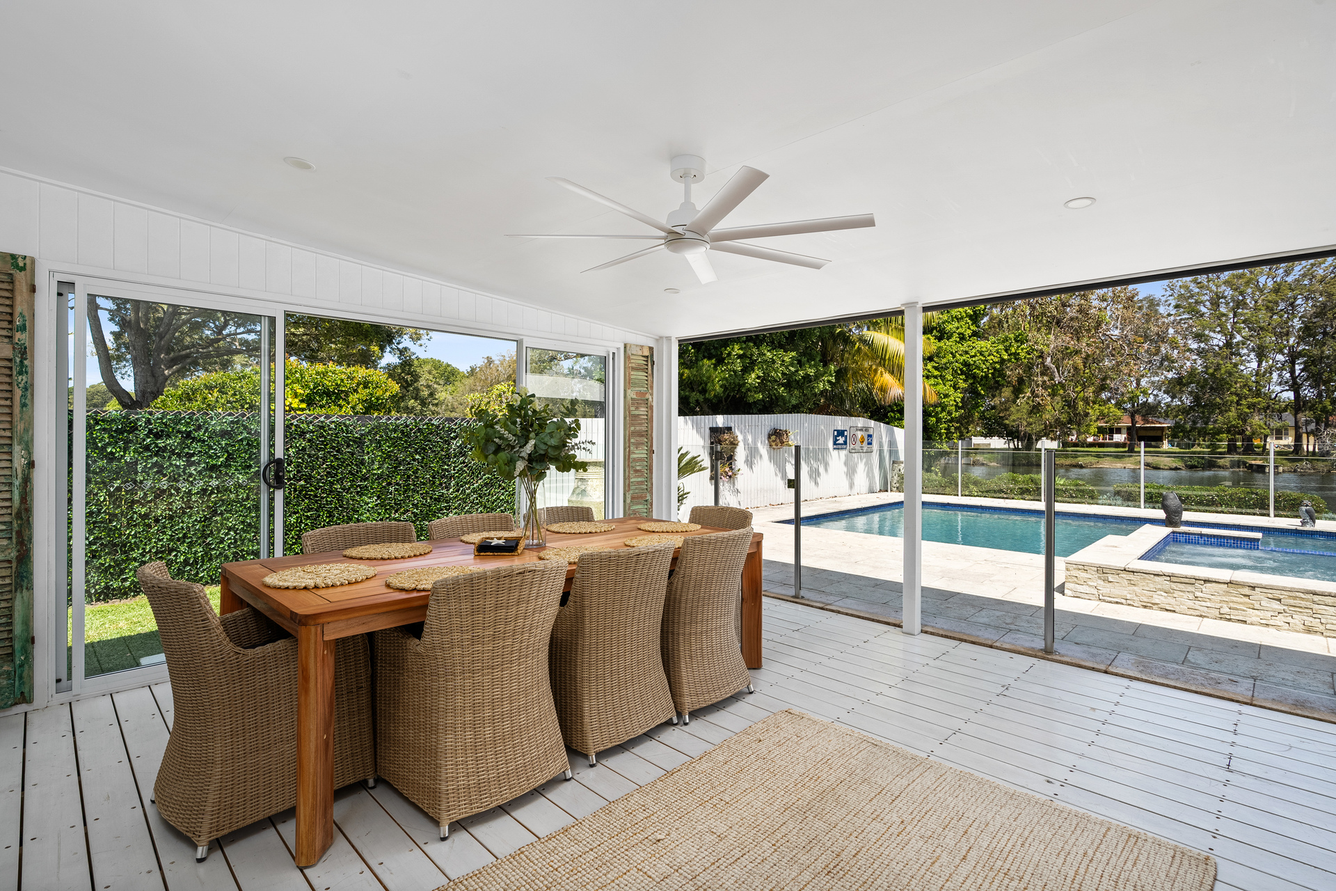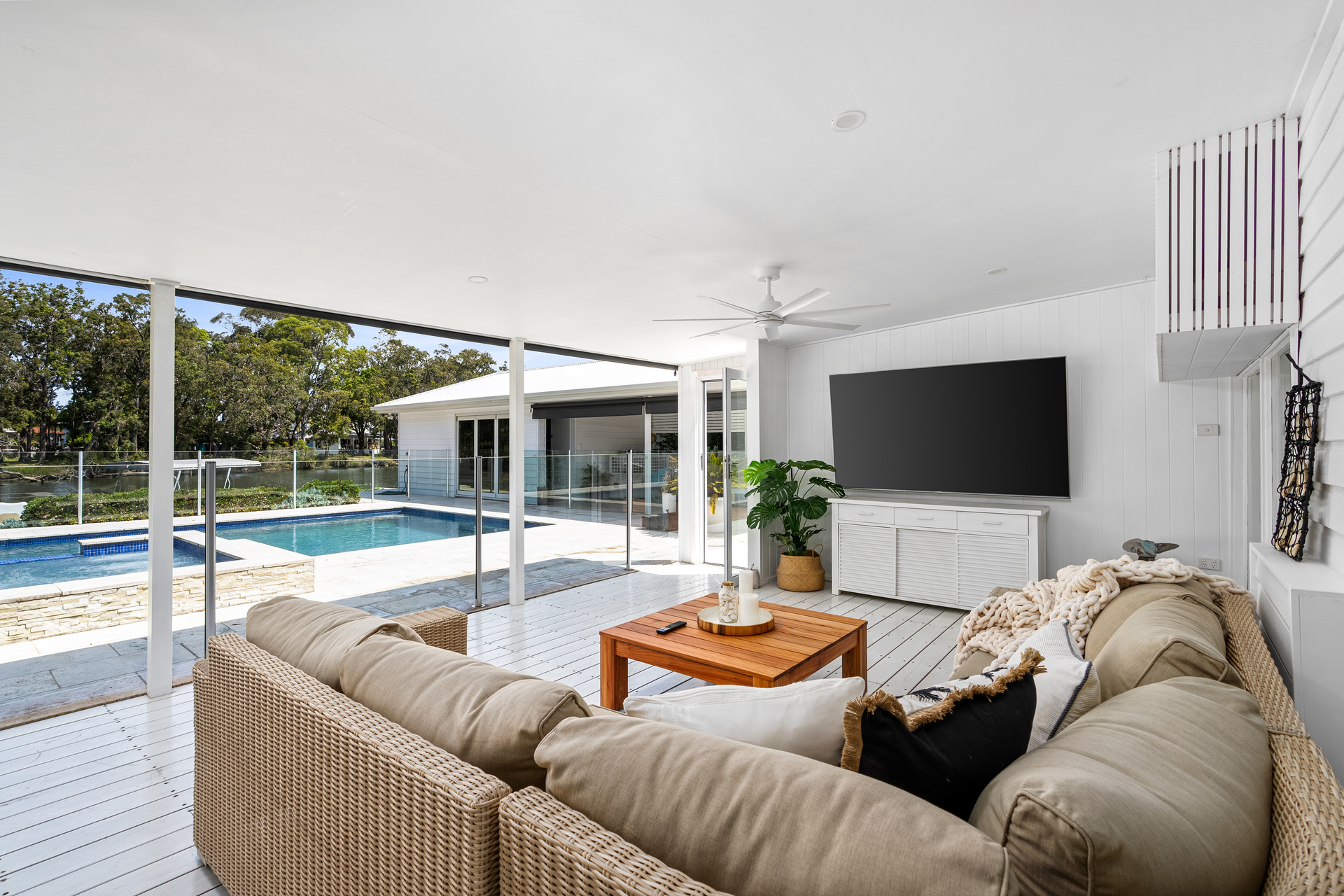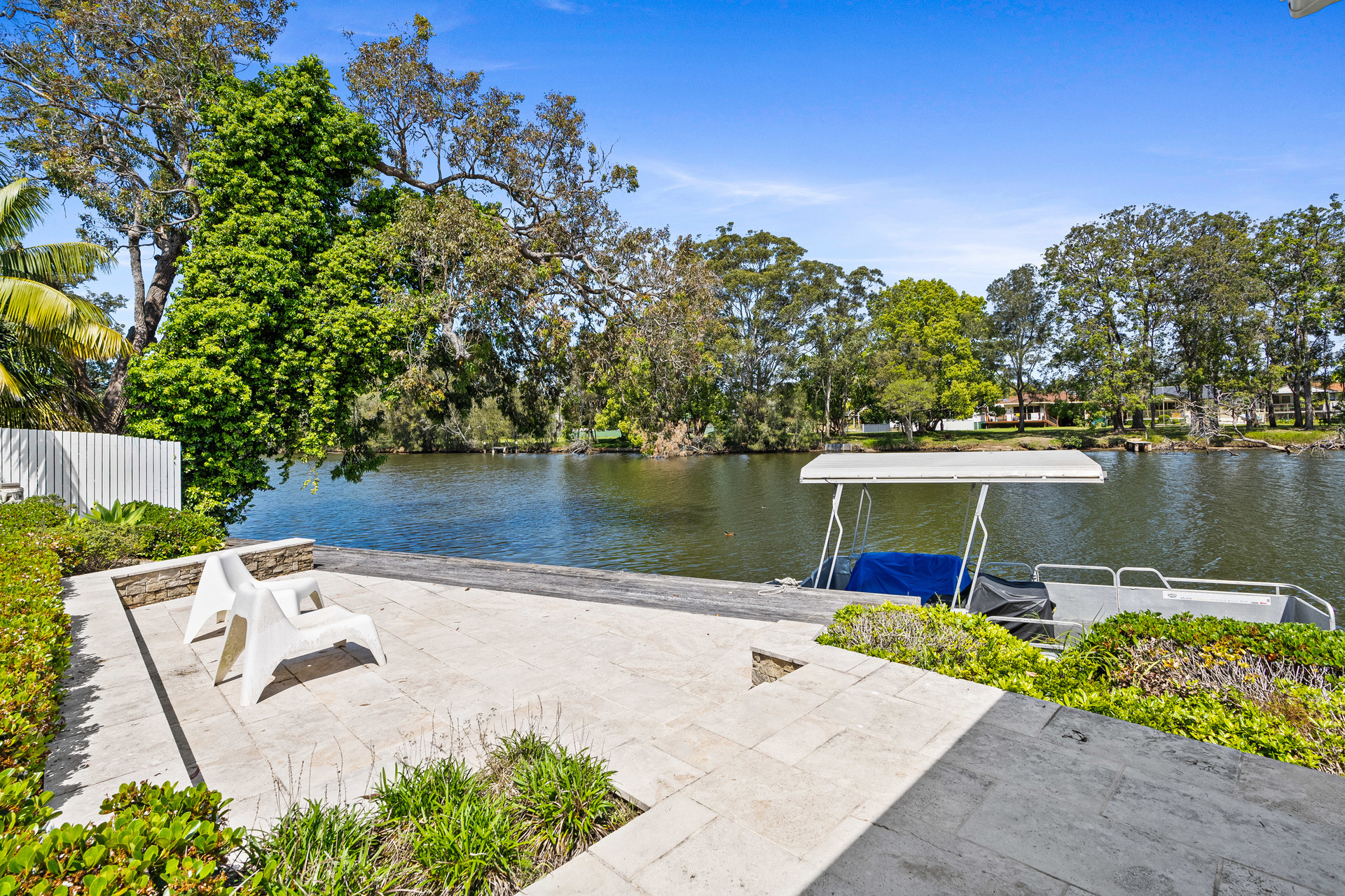 Step out to the enclosed sunroom, where the blinds open to bring the outdoors in, or head down to the timber deck and sitting area by the water, the ideal spot for fishing and quiet reflection. Potential boat mooring rights mean effortless access to the water, making every day a boating adventure. Enjoy fishing, kayaking, paddle boarding, jet skiing, and swimming from the comfort of your own backyard.
