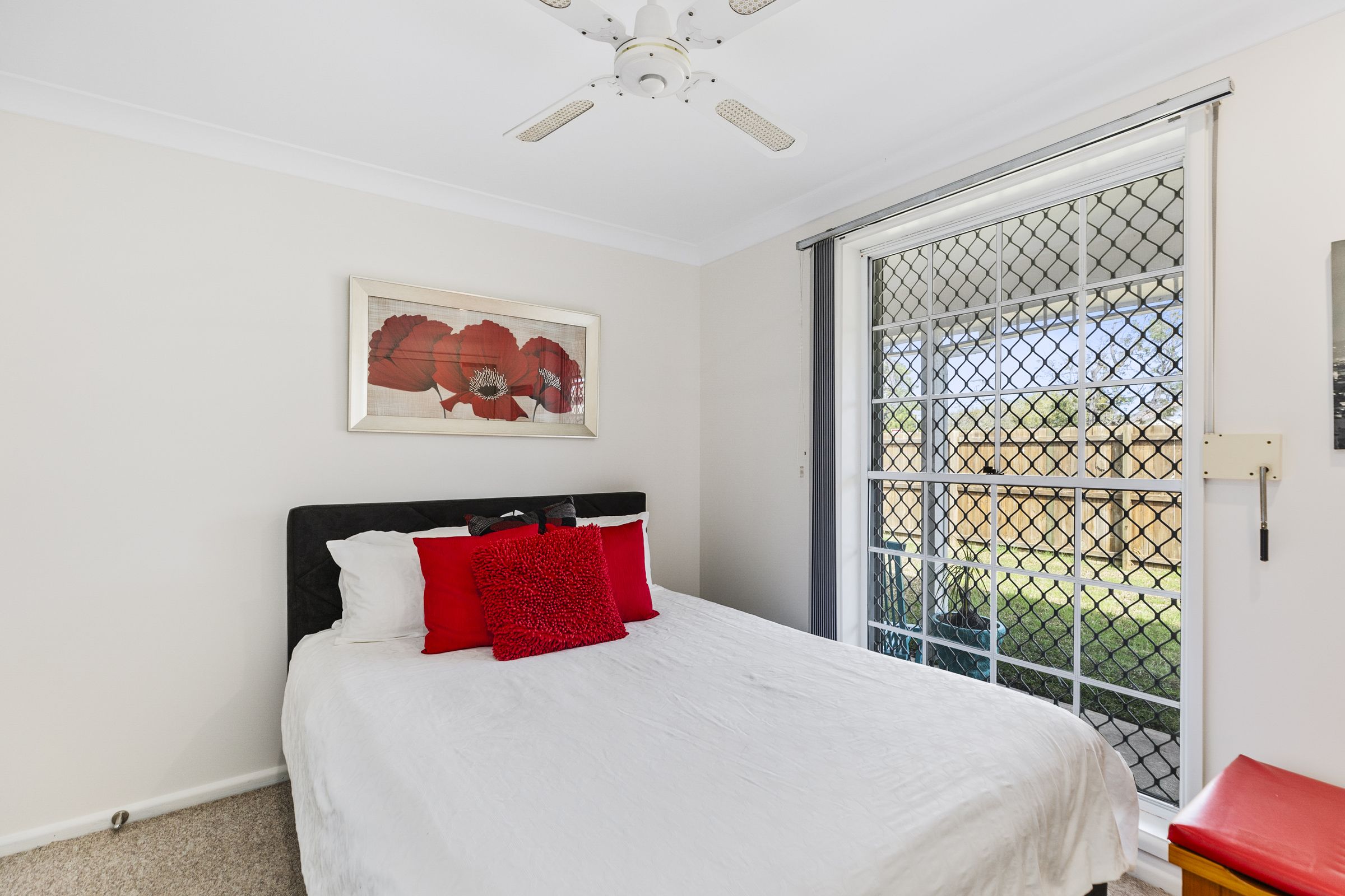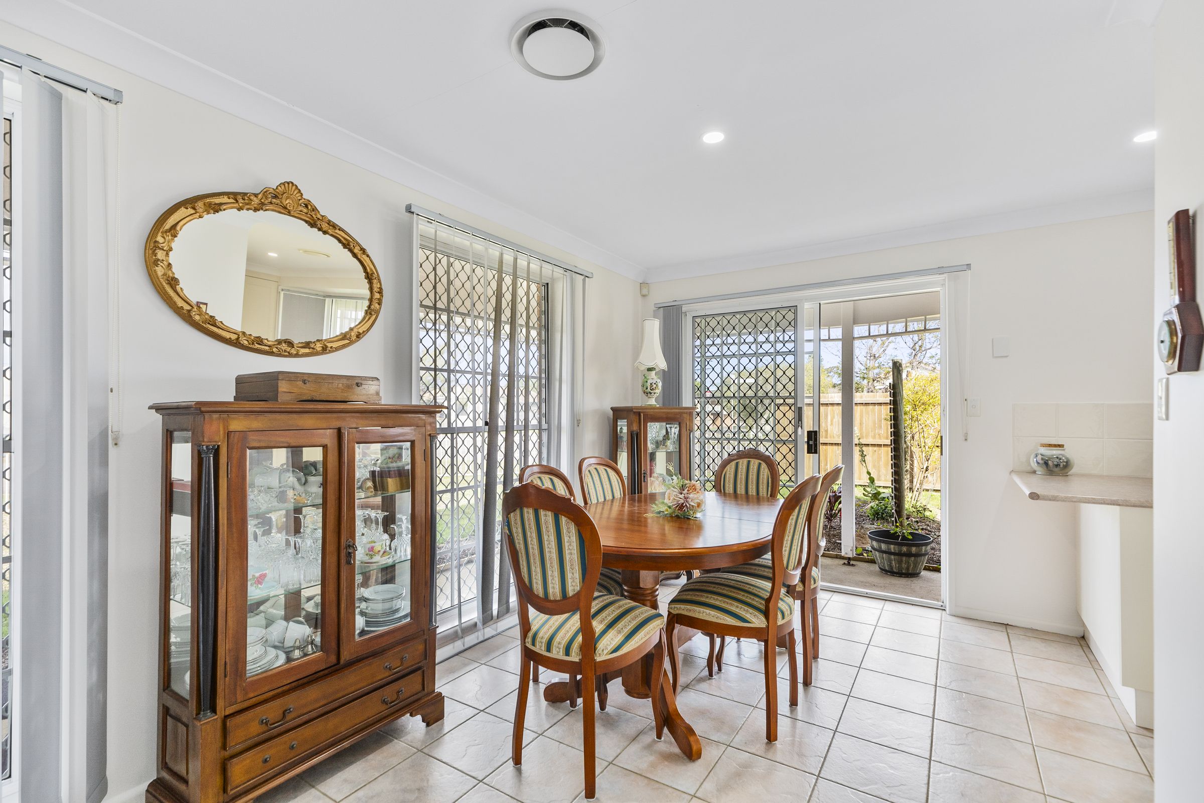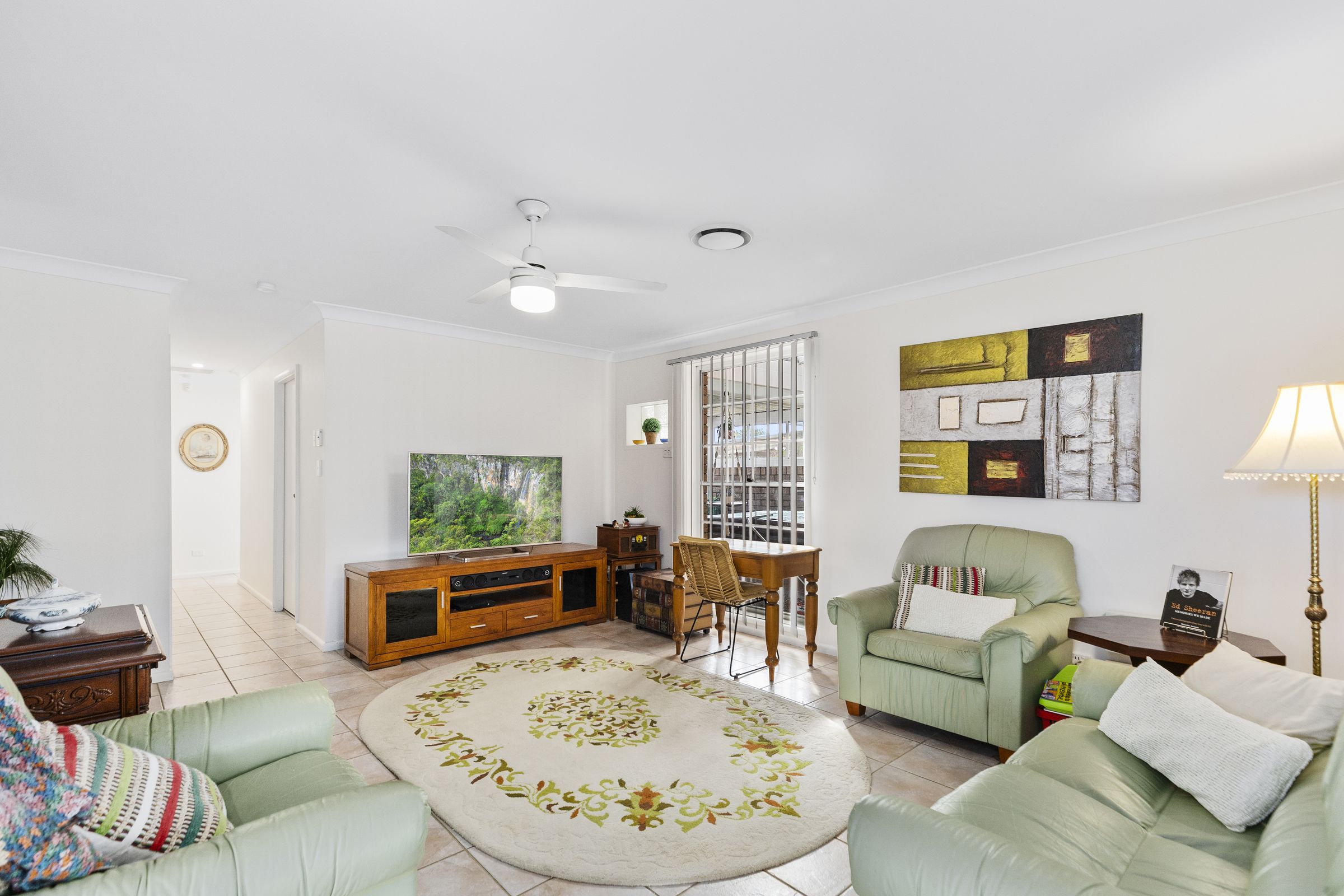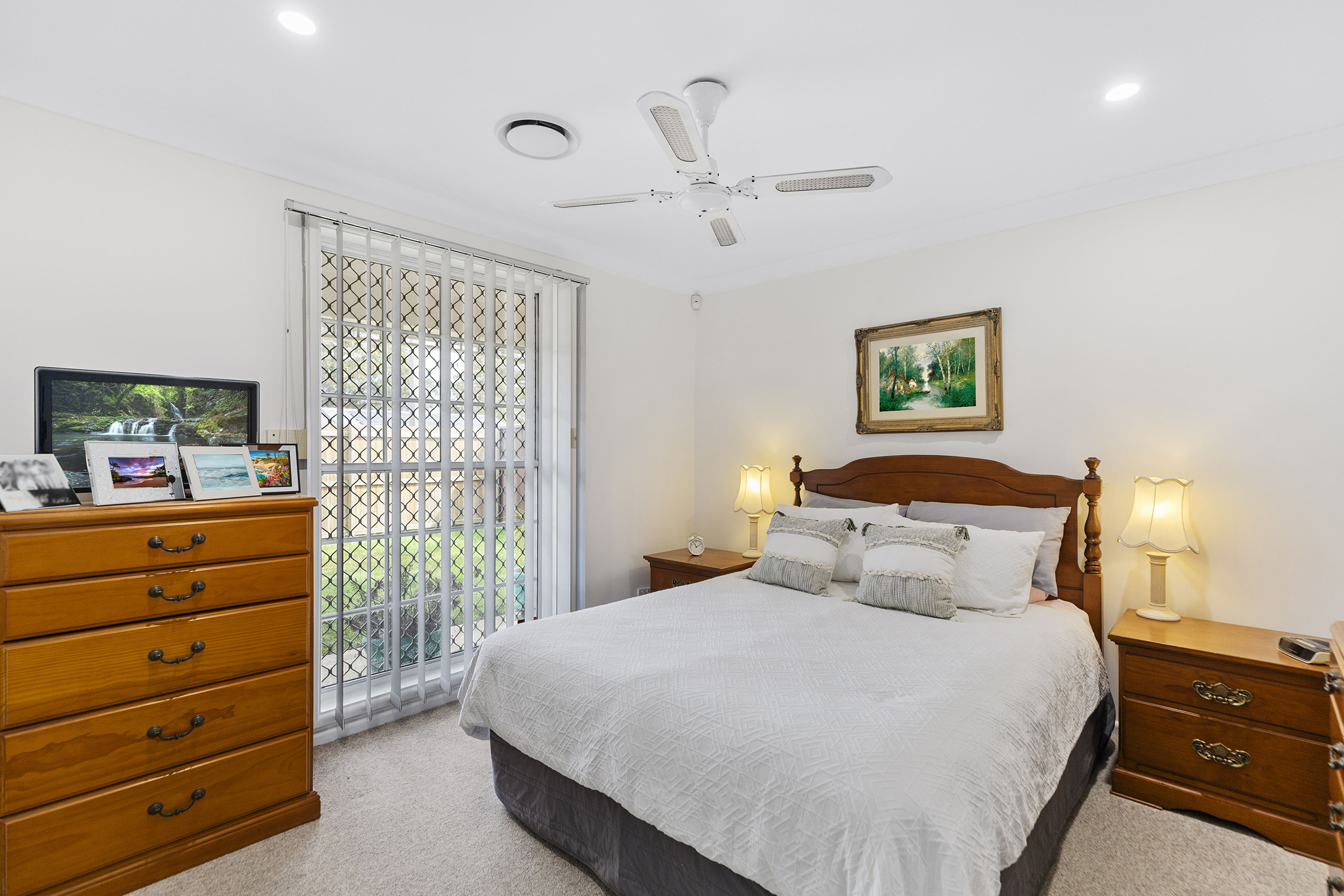 • Ducted Air-conditioning throughout, ceiling fans, outdoor shutters • Open plan living/ dining leads out to covered veranda and the private manicured lawns • Three double bedrooms with built-ins, calming garden vistas