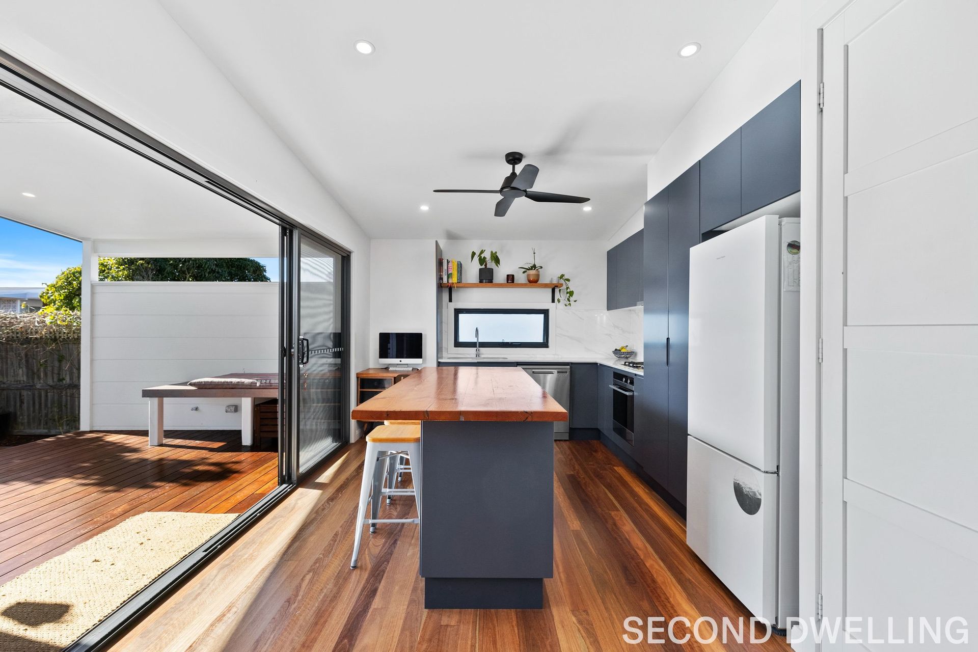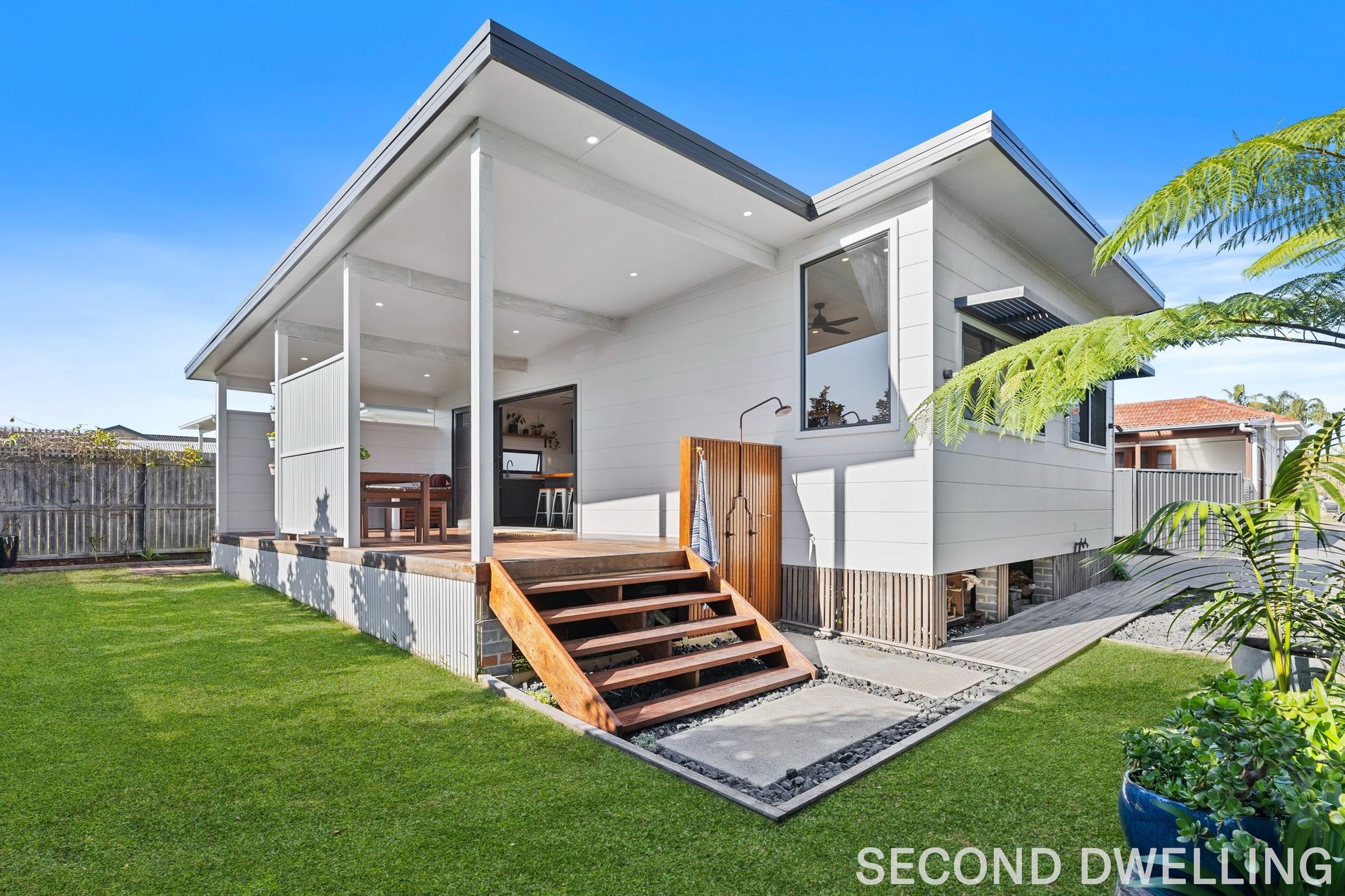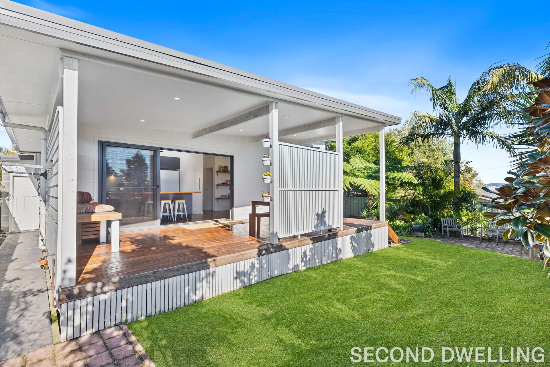 - 2 bedrooms, 1 bathroom with Velux skylight - Full kitchen with island bench and open living space - Private entrance with a sun-drenched patio and hot & cold outdoor shower - Two-car garage with remote roller door - Lush, landscaped gardens with mature trees offering privacy - Ideal for guests, rental income, or a home office/business