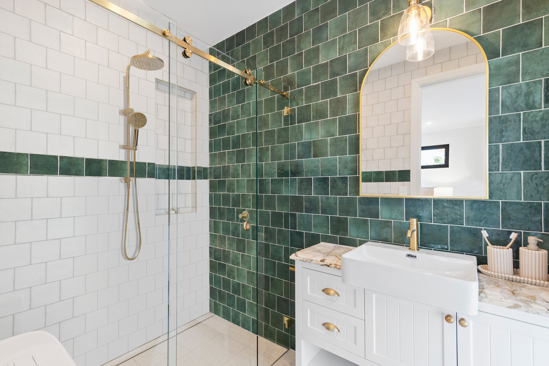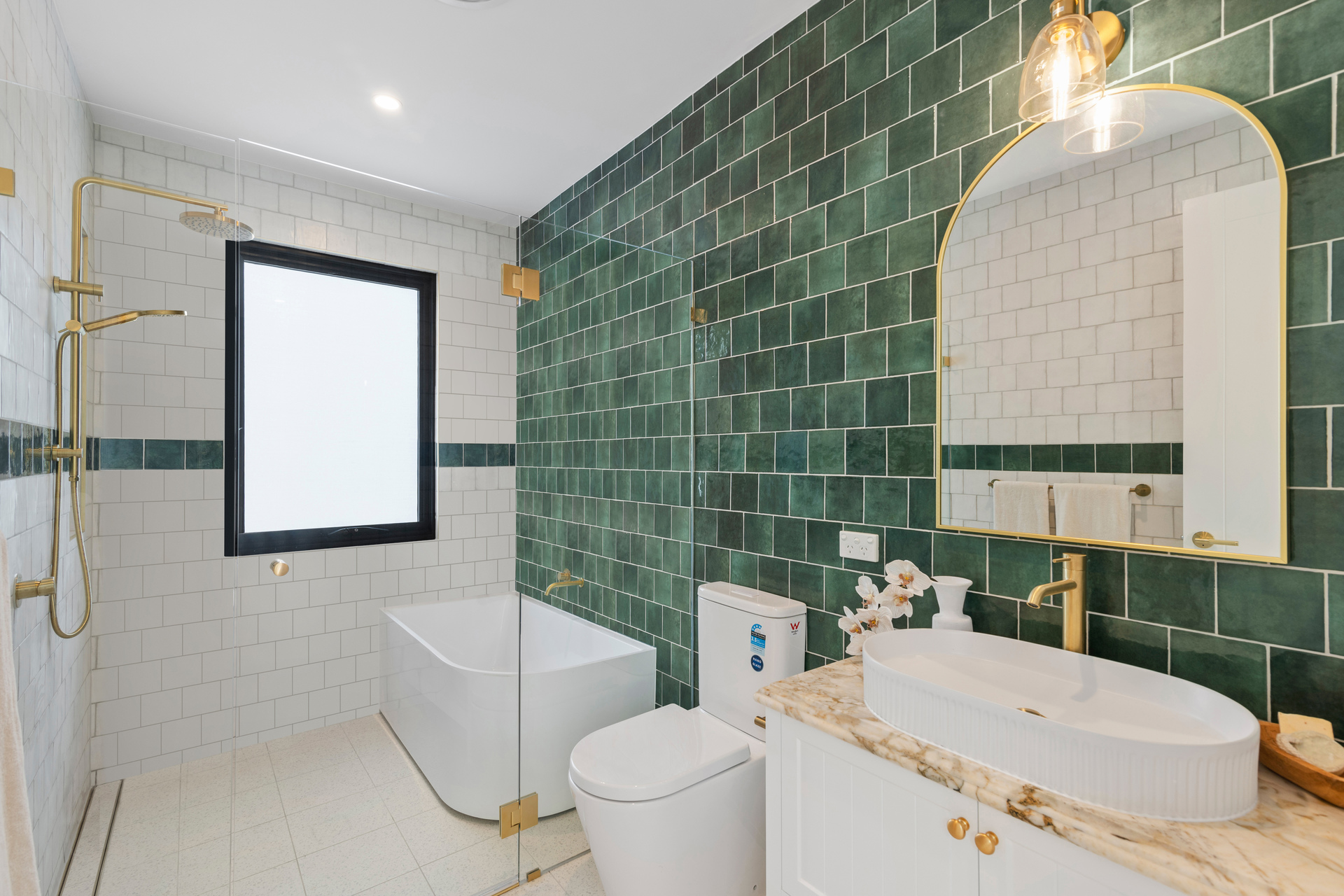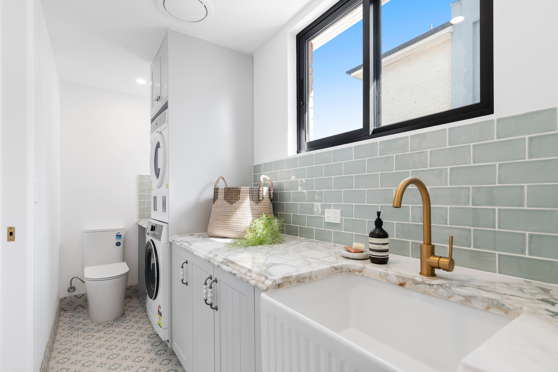 Both upper-level bathrooms are fully tiled with frameless glass showers and the main bathroom houses a full bath. The laundry room on the entry level of the home is family-sized with marble benchtops, stylish tiles and an additional guest w/c.