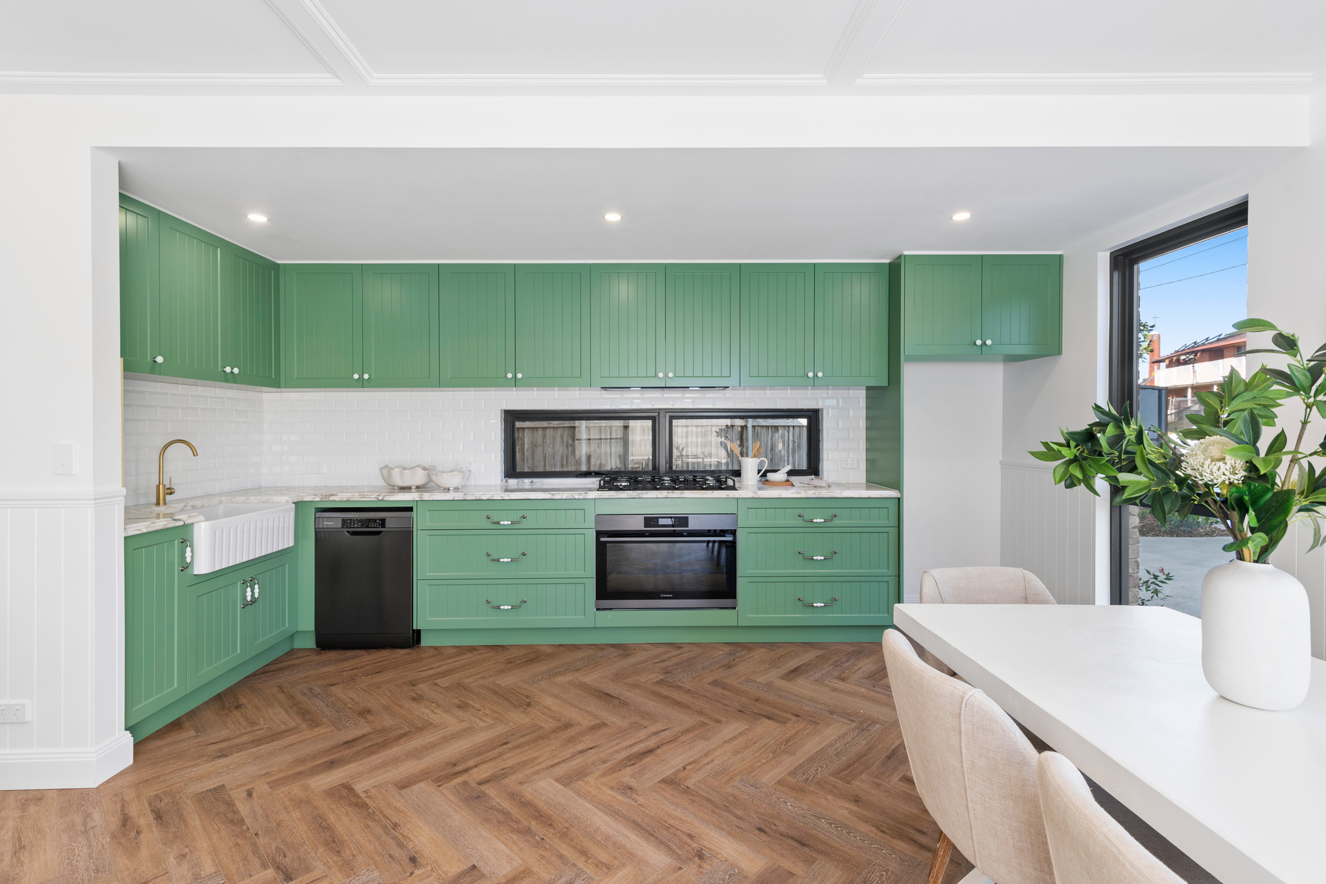 Designed as the heart of the home the magnificent marble kitchen shines with style and practicality. Free-flowing and packed with the latest features, it offers stunning marble bench tops, farmhouse sink with stylish tapware, 900mm gas stove and deep soft closing drawers.